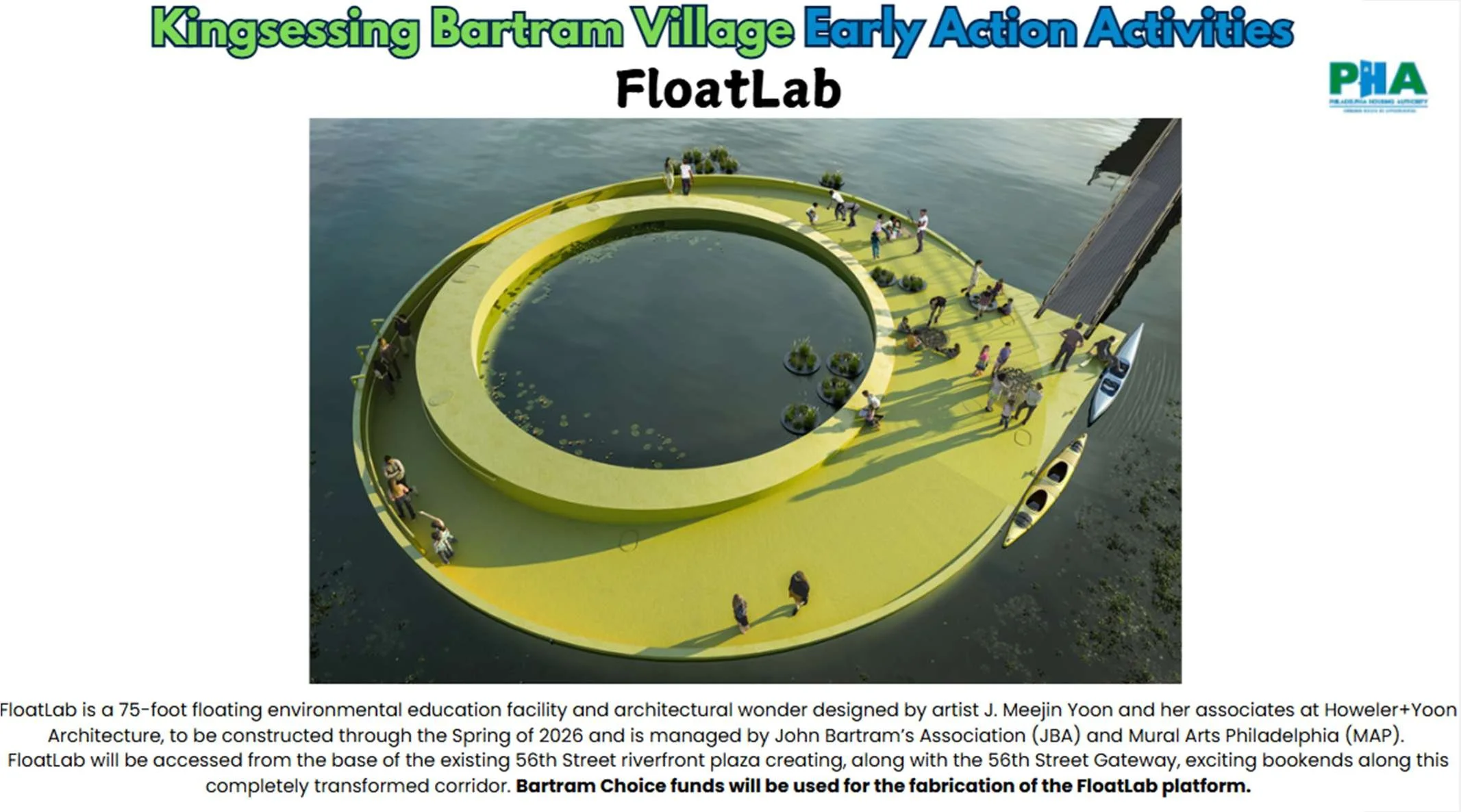 It is a 75-foot floating environmental education facility and architectural wonder, designed by artist J. Meejin Yoon and her associates at Howeler+Yoon Architecture, to be constructed through the Spring of 2026. The facility is managed by the John Bartram Association (JBA) and Mural Arts Philadelphia (MAP). FloatLab will be accessed from the base of the existing 56th Street riverfront plaza, creating, along with the 56th Street Gateway, exciting bookends along this completely transformed corridor. Bartram Choice funds will be used for the fabrication of the FloatLab platform.