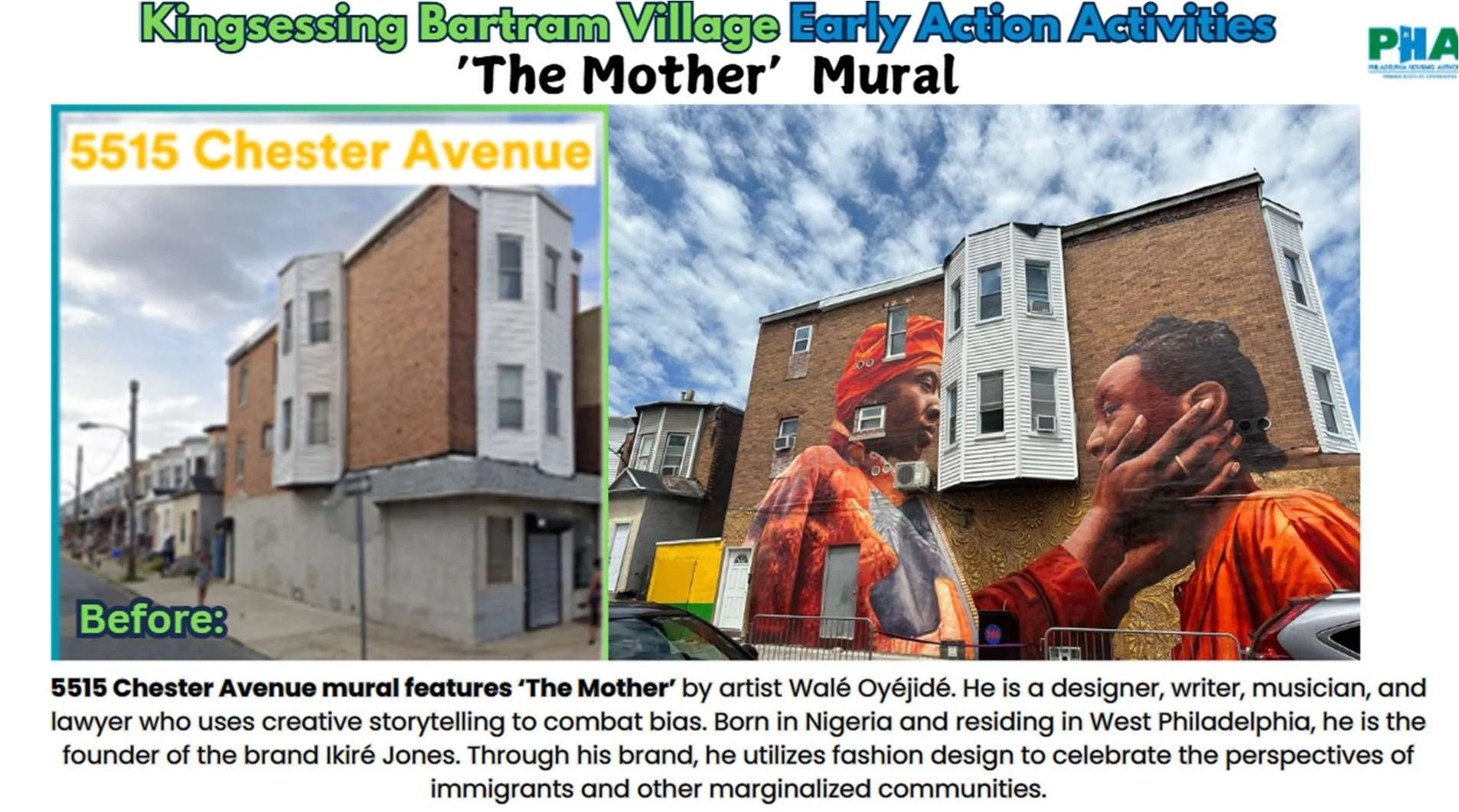 located at 5515 Chester Avenue by artist Walé Oyéjidé He is a designer, writer, musician, and lawyer who uses creative storytelling to combat bias. Born in Nigeria and residing in West Philadelphia, he is the founder of the brand Ikiré Jones. Through his brand, he utilizes fashion design to celebrate the perspectives of immigrants and other marginalized communities.