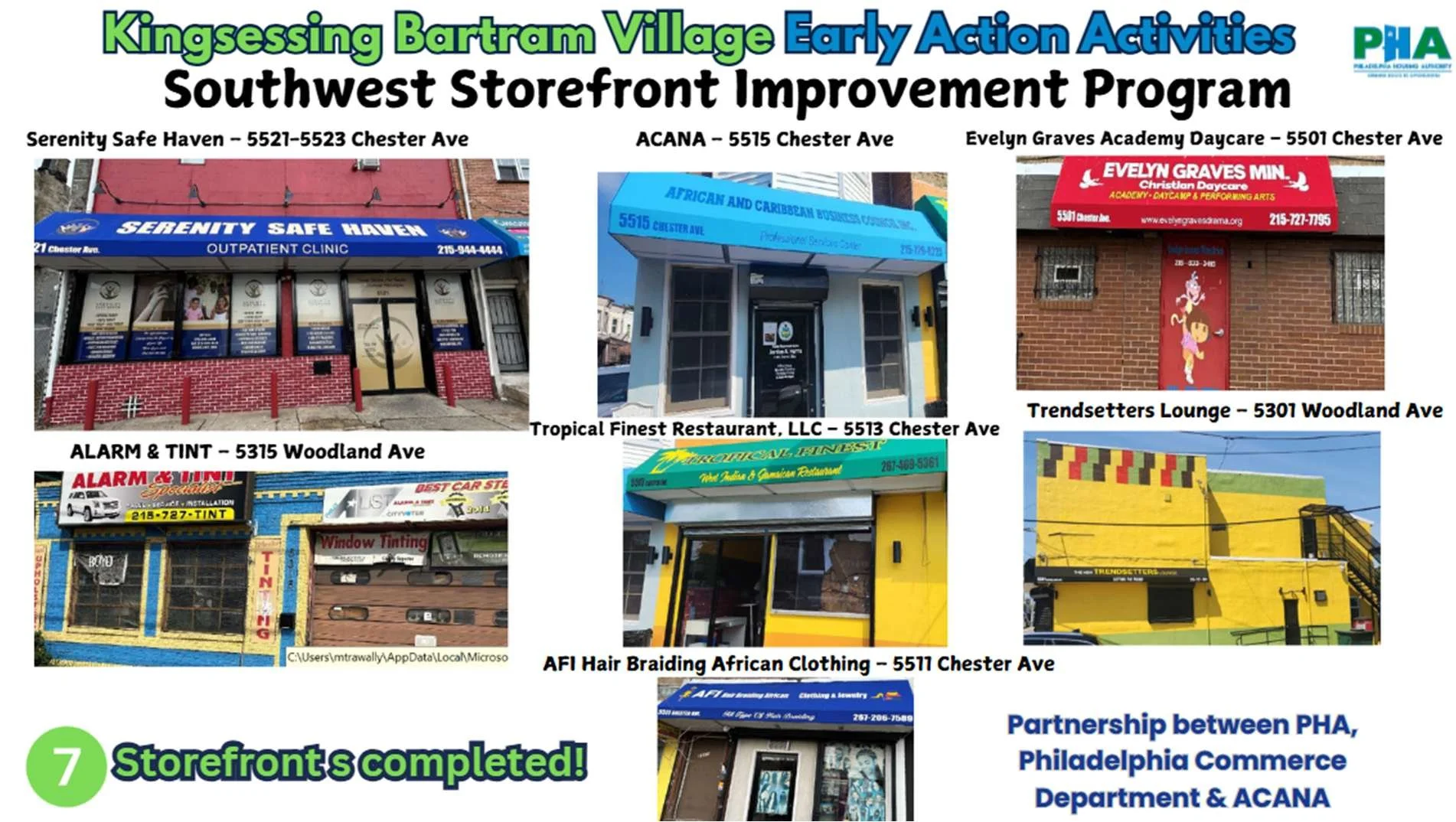 Southwest Storefront Improvement Program – In partnership with the Department of Commerce and ACANA, PHA funded the façade improvements of 7 storefronts along Woodland and Chester Avenues.