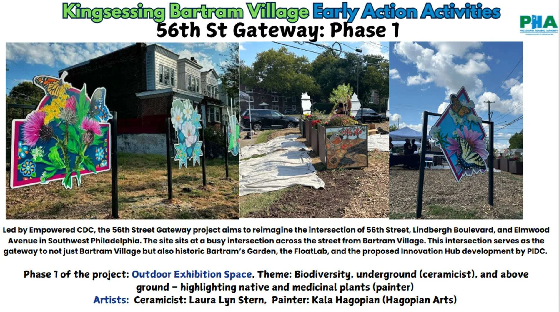 Led by Empowered CDC, the 56th Street Gateway project aims to reimagine the intersection of 56th Street, Lindbergh Boulevard, and Elmwood Avenue in Southwest Philadelphia. The site sits at a busy intersection across the street from Bartram Village. Phase 1 of the project: Outdoor Exhibition Space, Theme: Biodiversity, underground (ceramicist), and above ground – highlighting native and medicinal plants (painter). Artists: Laura Lyn Stern (Ceramicist), Kala Hagopian, Hagopian Arts (Painter).